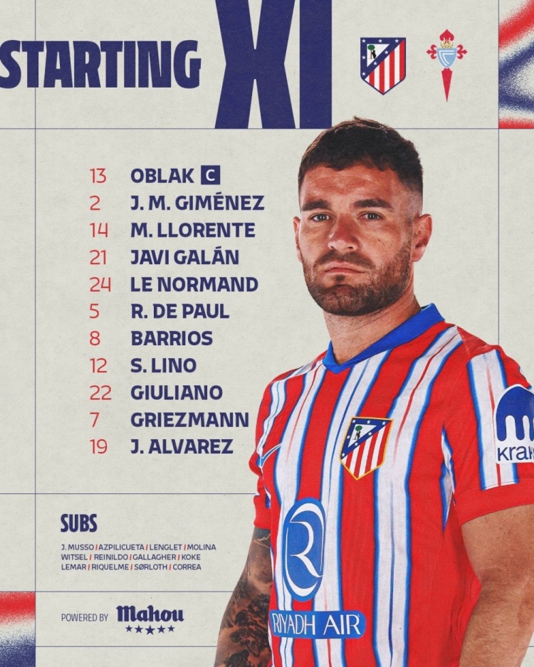 - 马竞对阵塞尔塔首发:阿尔瓦雷斯、格列兹曼领衔,小西蒙尼出战
